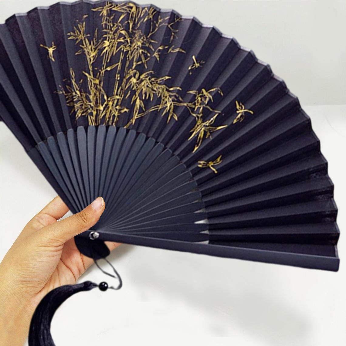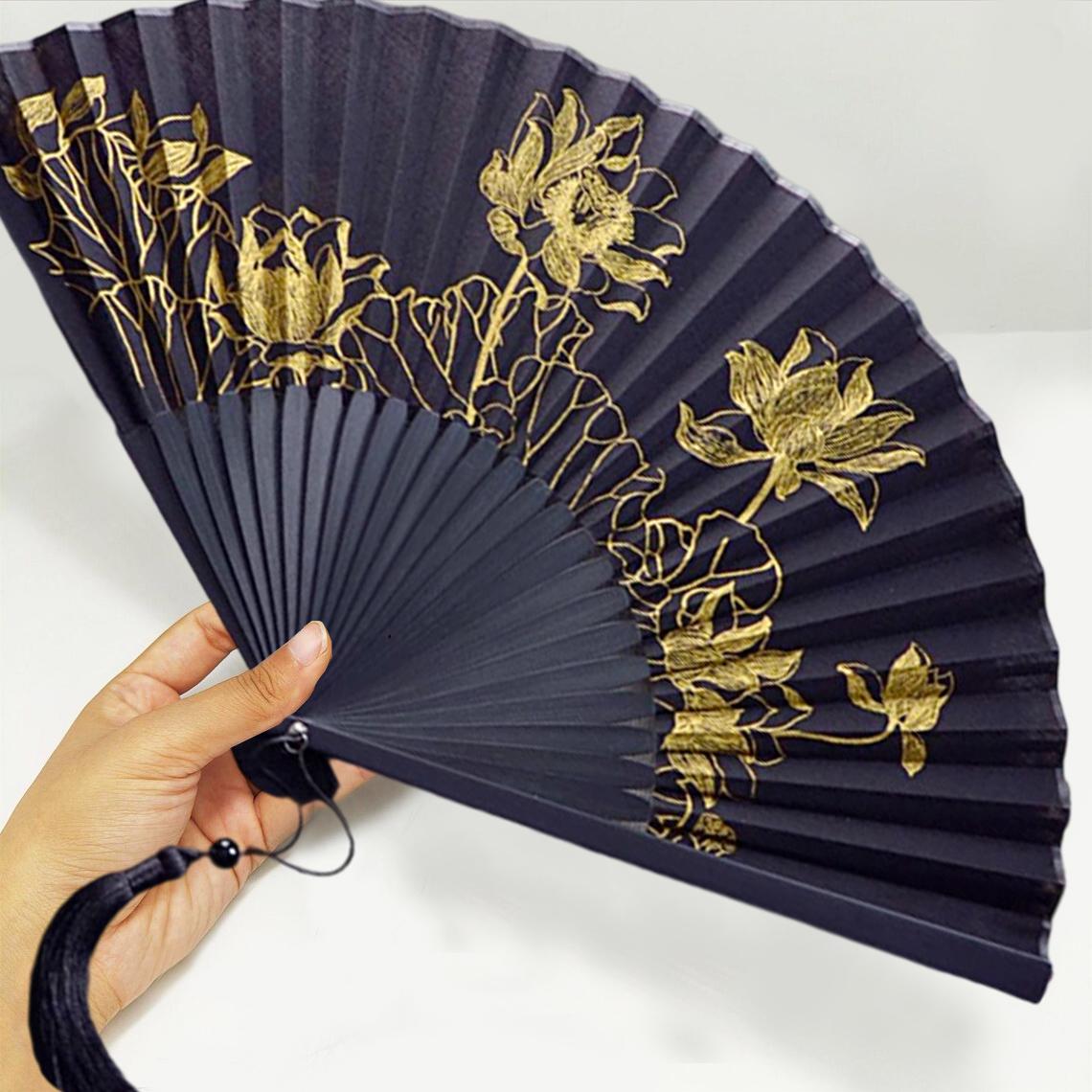 This folding fan features a striking black background decorated with elegant metallic gold lotus flowers and trailing stems, creating a refined and dramatic look. The deep dark fan surface gives the design a bold contrast, allowing the floral artwork to stand out beautifully with a graceful Oriental-inspired aesthetic.