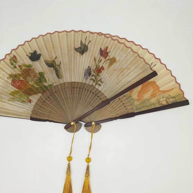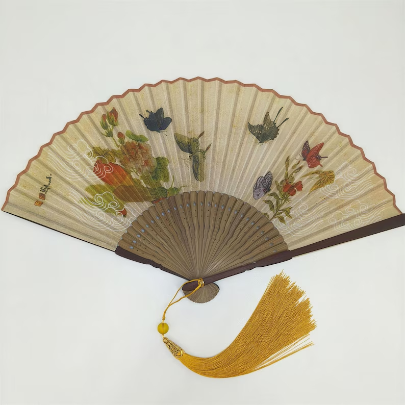 The fan is finished with natural wood-toned ribs, darker outer guards, and a long golden yellow tassel that adds an elegant decorative touch and beautiful movement.
