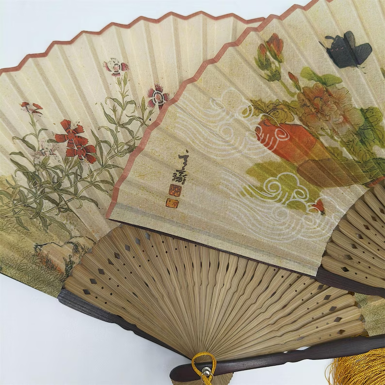 This decorative folding fan features a soft cream-beige background with a graceful, vintage-inspired nature scene spread across the pleated surface. The design is detailed and richly layered, combining butterflies, florals, a small green bird, and an orange koi-like fish motif for an elegant Oriental look.